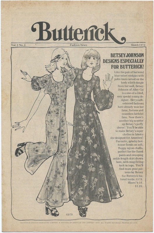 The earliest of Johnson’s Butterick Young Designer patterns refer to her as Betsey Johnson of Alley Cat, and most seem to predate the founding of her company in 1978. Here’s Butterick 6979 on the cover of the March 1973 issue of Butterick’s news leaflet: