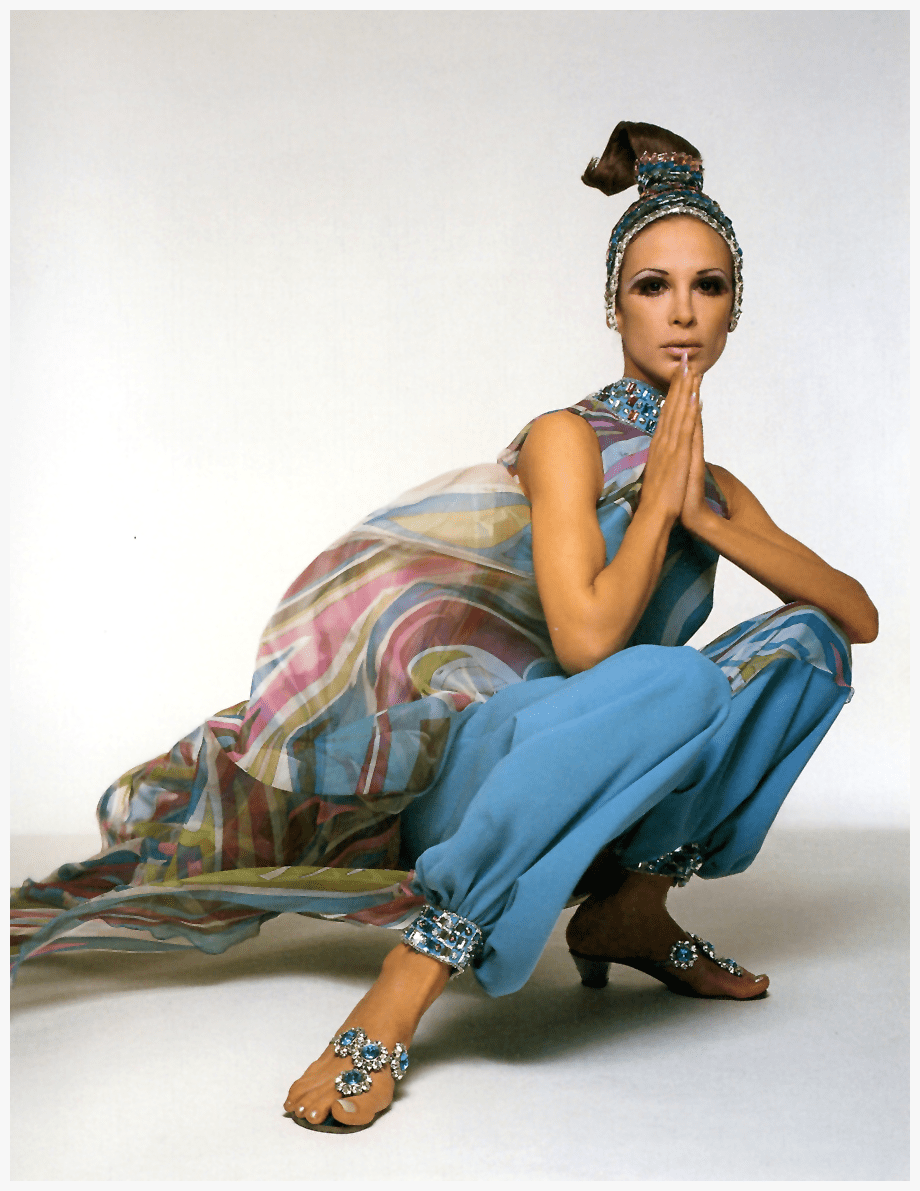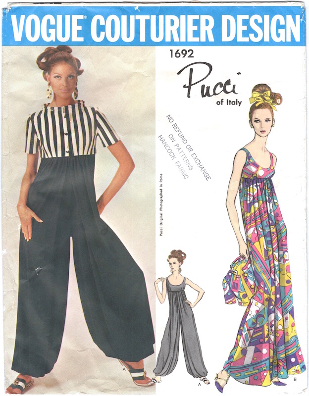 Pucci’s interest in harem pants predates the jewelled version at the top of this post: a short, blue harem ensemble was part of his 1965 Braniff flight attendant uniform. These high-waisted palazzo pyjamas also have a cuffed, harem option, as worn by Editha Dussler: