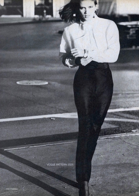 Early in Gianni Versace’s career, Vogue magazine featured one of his Vogue patterns, as worn by the young Gia Carangi. The pleated blouse, pants, and cummerbund were shown in black and white silk taffeta.