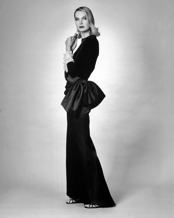 The designers used stretch velvet for the top and a lustrous satin for the draped evening skirt with bow accent.