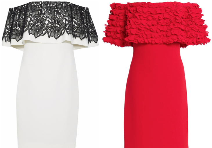Other versions of the gown omit the grommets and embellish the flounce with lace or appliqué. The white dress is cocktail length:
