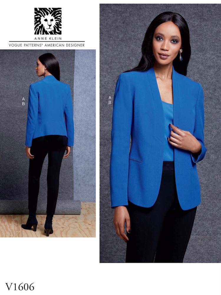 From Sharon Lombardo for Anne Klein, an open-front tuxedo jacket and skinny stretch pants. The originals were crepe and ponte knit.