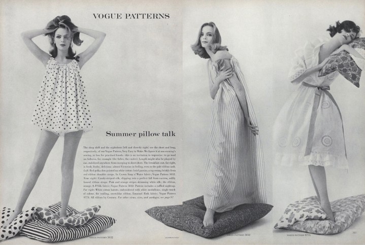The patterns are Vogue 9774 and 5032, a ruffled breakfast coat and nightgown / short pyjamas and nightcap.
