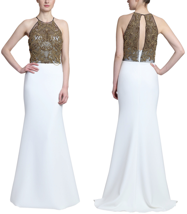 Badgley Mischka’s formal gown features a halter neckline with lace décolletage overlay.