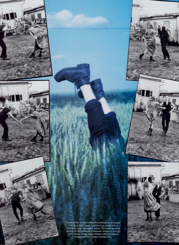 The Vogue team travelled to rural Pennsylvania for the shoot. In the opening spread and barnyard square-dancing sequence, Christy Turlington wears simple dresses, made up in cotton broadcloth from Sutter Textiles.