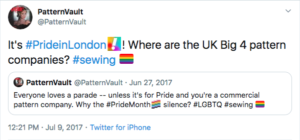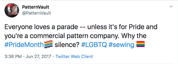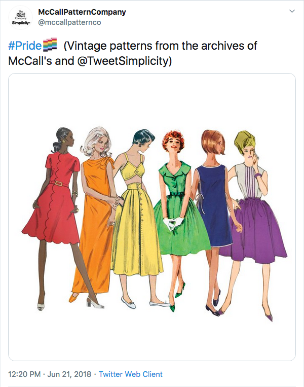 Despite being headquartered in New York, the big pattern companies have an uneven record of celebrating Pride — at least visibly, on social media. In past years, I’ve tweeted about this silence.