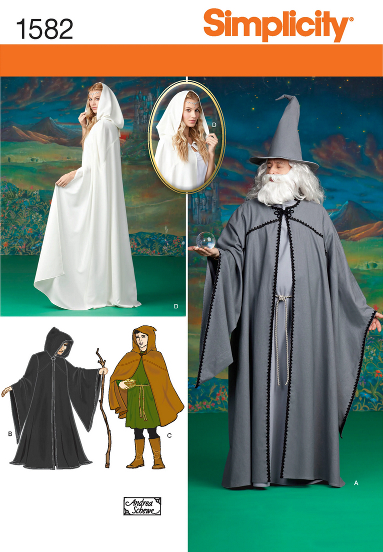 From 2001, this Simplicity pattern for a Middle-earth cape, tunic, and hat must have anticipated The Fellowship of the Ring. Includes Galadriel, a Black Rider / Ringwraith, and… Radagast the Brown? (The wizard was not seen on-screen in the Lord of the Rings trilogy.)