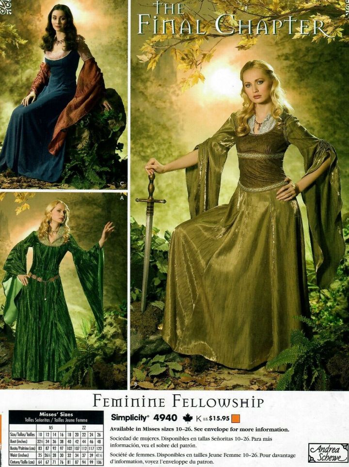 In their marketing materials, Simplicity alluded to The Return of the King as “The Final Chapter.” These women’s costumes include Arwen and Éowyn.
