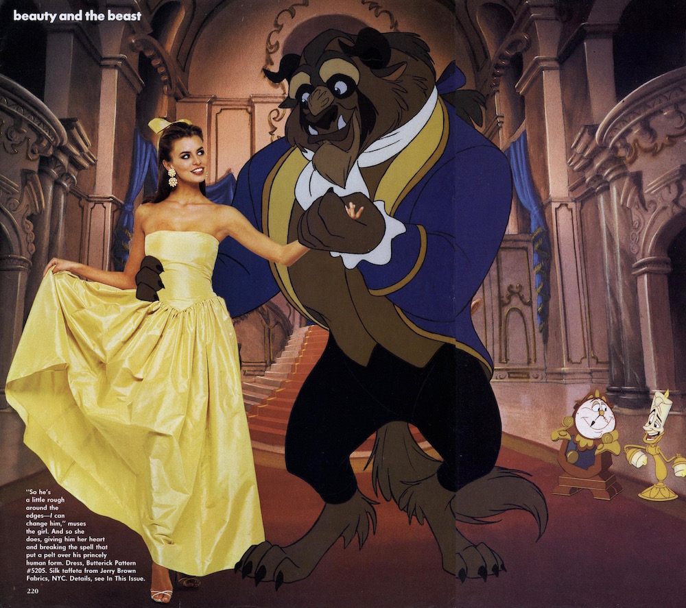 As part of their 1991 holiday issue, Vogue published this image of supermodel Niki Taylor as Belle to Disney’s Beast, with Cogsworth and Lumière looking on. Her gown was made using Butterick 5205 and yellow silk taffeta from Jerry Brown Fabrics, NYC.