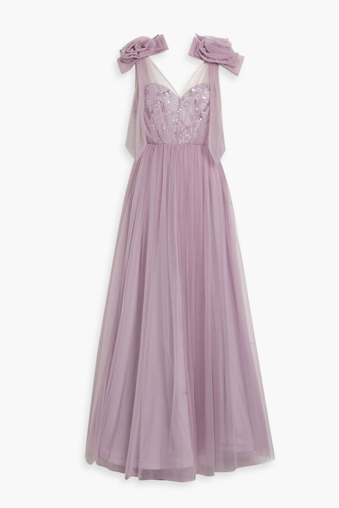 The “secret gardens” of Savannah, Georgia were the inspiration behind the tulle gown with rosettes at the shoulders — a design from Badgley Mischka’s Spring 2024 collection.