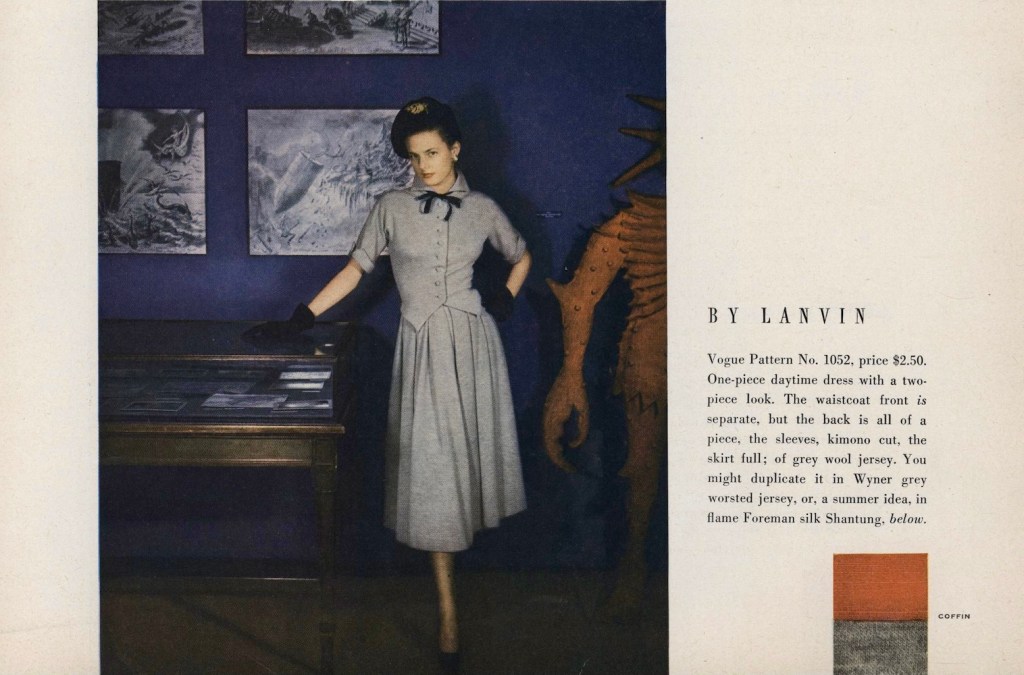 When Vogue’s Clifford Coffin photographed the first batch of Paris Originals on location in Paris, circa 1949, he shot the Lanvin design in a museum setting, beside a fantastical red figure that’s mostly out of the frame.