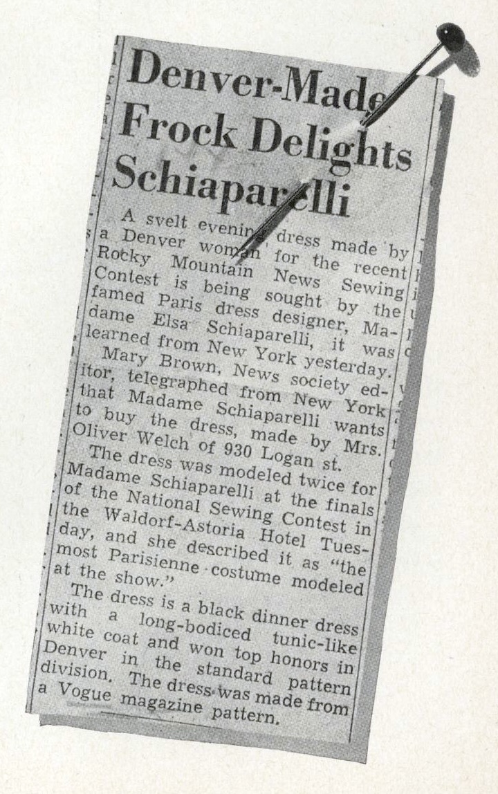 “Madame Elsa Schiaparelli, now in New York supervising her perfume business, is to speak in the autumn for the Defense Savings campaign. Her black crêpe dinner-dress with a white wool jacket was made from a Vogue Design by Mrs. Oliver Welch of Denver; won a sewing contest which Schiaparelli judged; was bought by Schiaparelli herself”