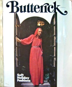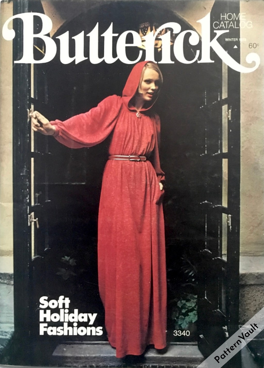 A red, hooded, designer maxi dress makes the case for “Soft Holiday Fashions” on this festive Butterick home catalogue cover from Winter, 1973.